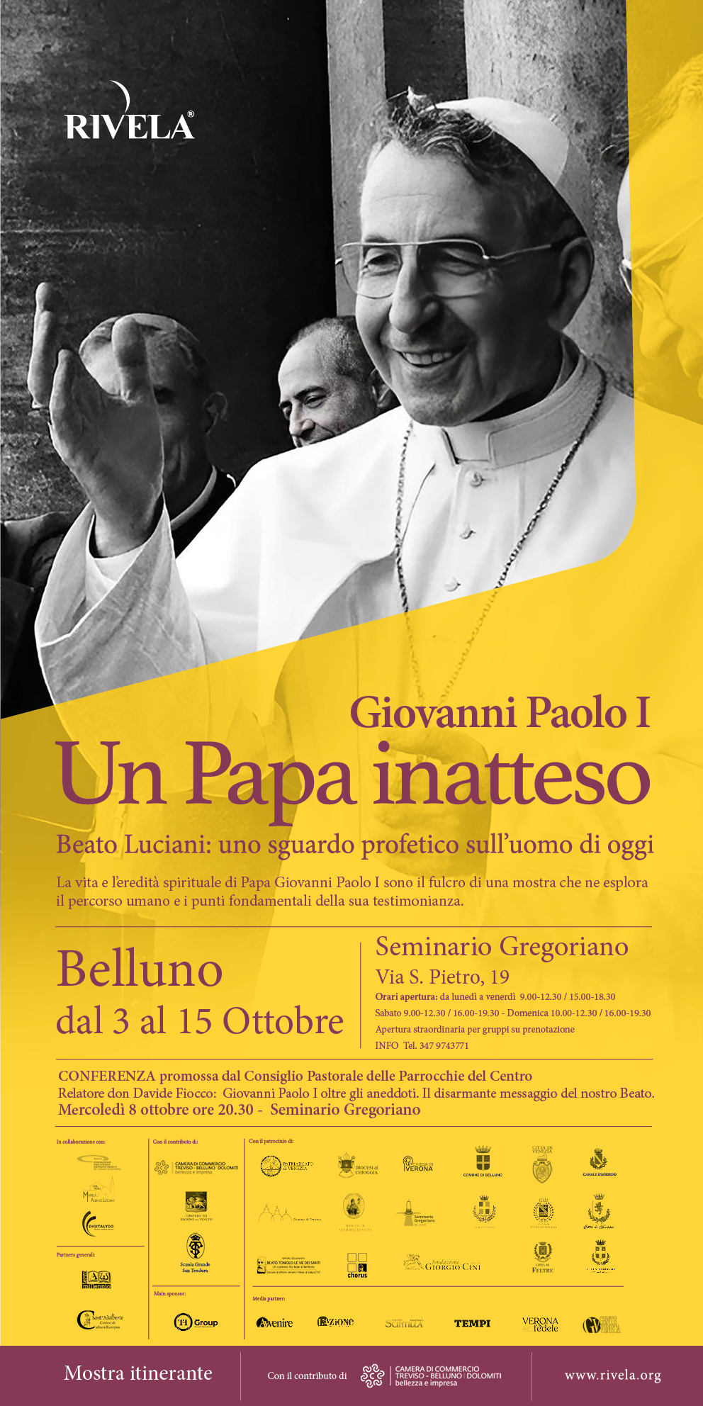 La mostra è organizzata dall’Associazione Rivela APS di Verona, in collaborazione con la Fondazione Papa Luciani Giovanni Paolo I di Canale d’Agordo (BL) e con il Museo Albino Luciani di Canale d’Agordo (BL), con il patrocinio delle Diocesi del Veneto e di numerosi Comuni della regione.